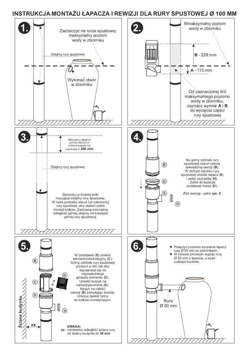 - połączyć szczelnie łapacz wody ze zbiornikiem na deszczówkę przy pomocy węża o średnicy Ø50 mm