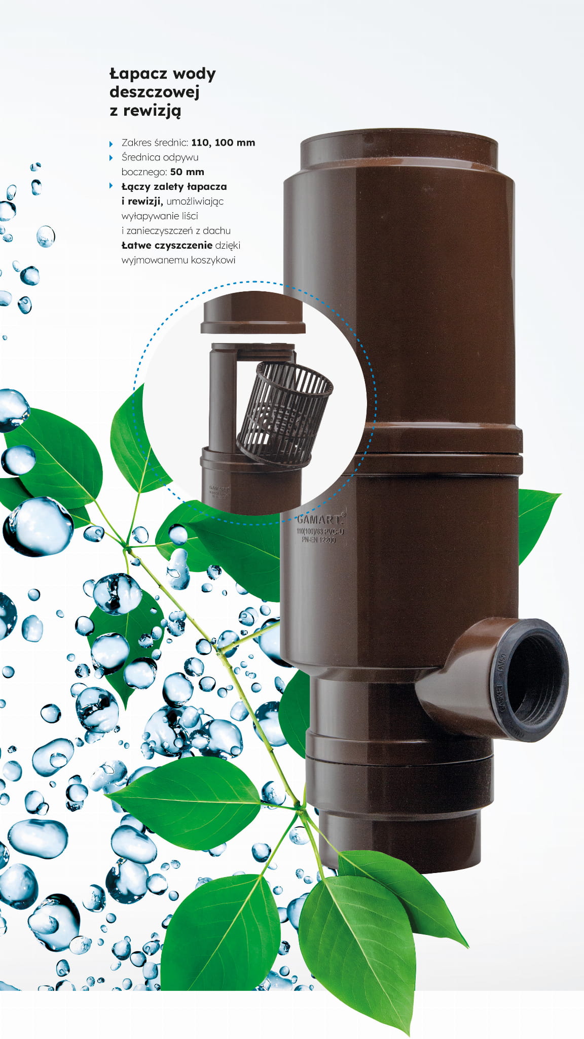 Łapacz w wersji PRO to już kolejny, innowacyjny produkt naszej marki Gamart. Zbieracz wody z rewizją przeznaczony jest do przechwytywania wody deszczowej z rury spustowej rynny o średnicy Ø100 mm. W górnej części łapacza znajduje się rewizja z sitkiem, która służy do wyłapywania liści i innych zanieczyszczeń z dachu. Produkt pasuje do systemu rynnowego: Kaczmarek.